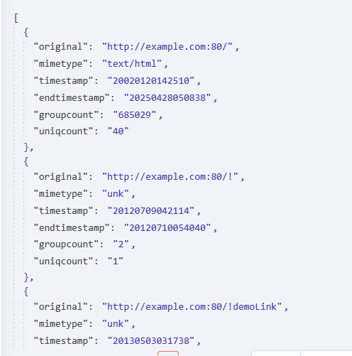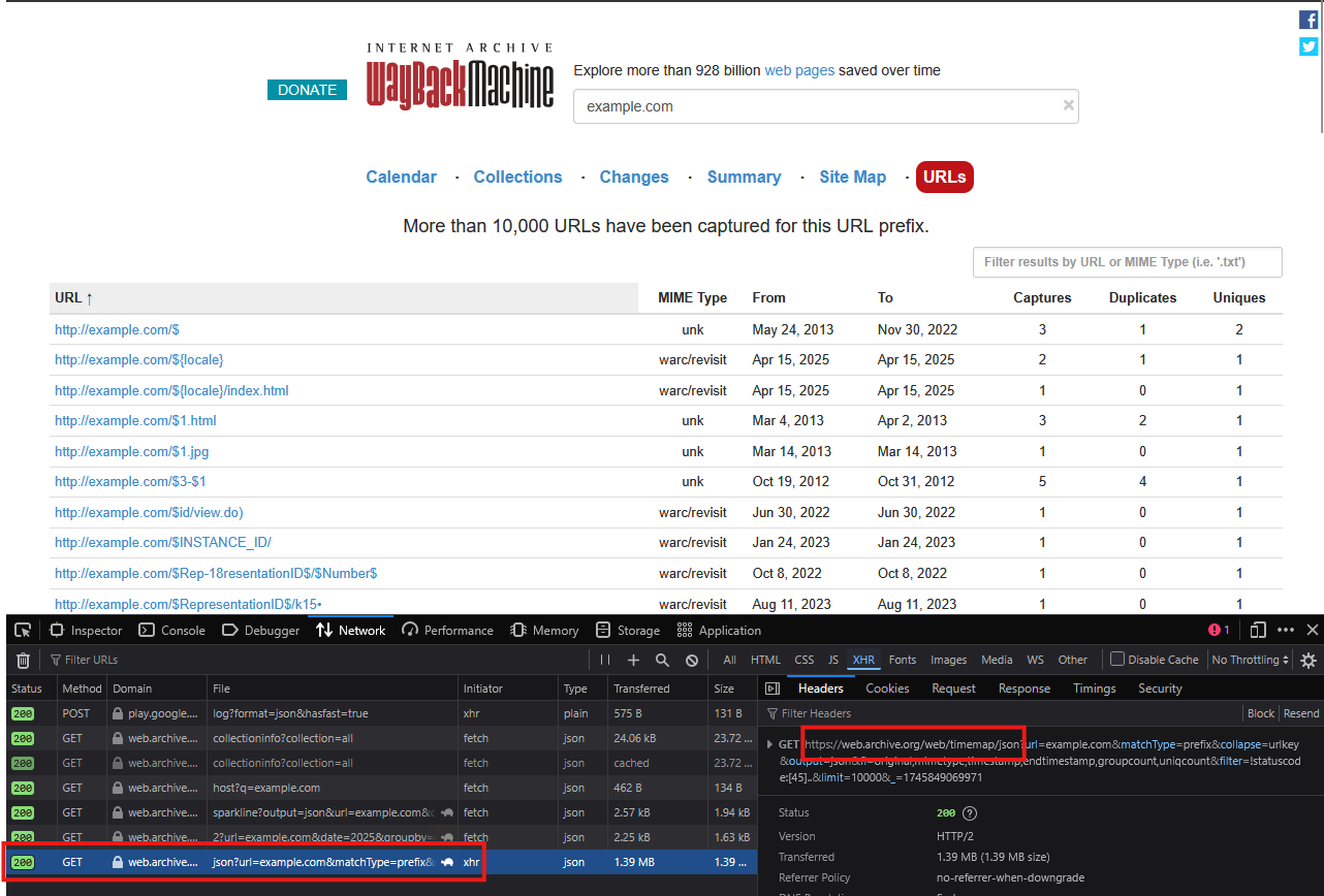 กลับมาที่ Wayback machine สักแป้บนึงครับ ให้เราค้นหา request ที่จะนำมาใช้งาน ซึ่งในกรณีนี้จะเป็น https://web.archive.org/web/timemap/json ครับ