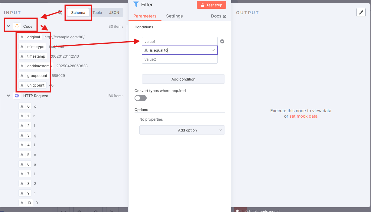 เลือกเป็น Schema แล้วดูตรง Node ที่ชื่อว่า "Code" ซึ่งเป็น Node ก่อนหน้า ในที่นี้เราสามารถ drag & drop ข้อมูลที่เราต้องการได้เลยครับ ให้เลือก "mimetype" ลากมาวางตรง "value1"