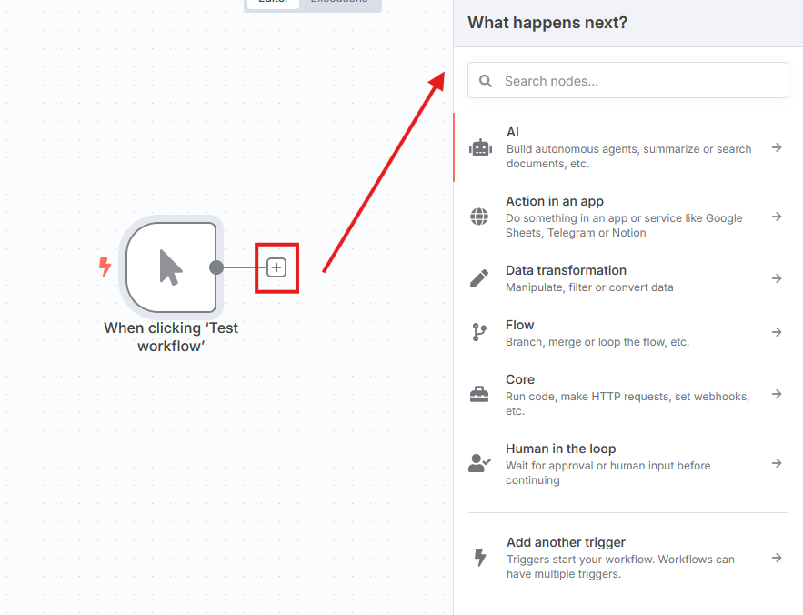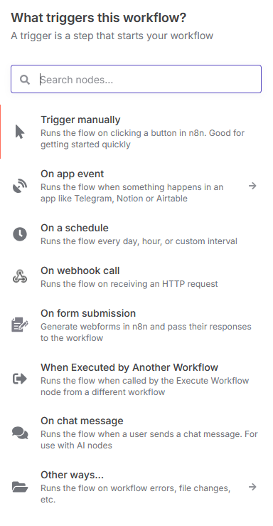 โดยเมื่อกดปุ่ม "+" กลางจอหรือมุมขวาบนแล้วจะพบกับ Trigger Node ครับ (ภายใน N8N เราจะเรียกเครื่องมือแต่ละตัวว่า Node นะครับ)