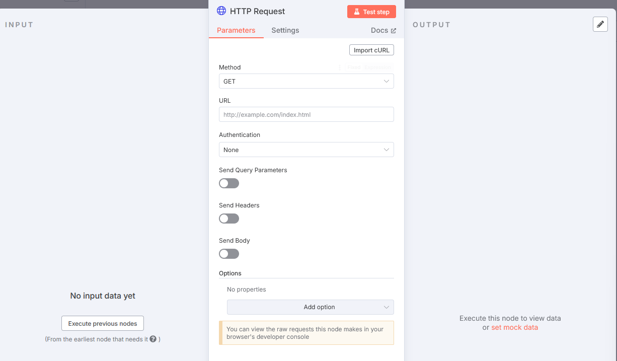 - กลาง Settings: เป็นการตั้งค่าของ Node นั้น ๆ ซึ่งจะขึ้นอยู่กับว่าเป็น Node อะไร ในกรณีจะมี "Method", "URL", "Authentication" และอื่น ๆ ตามด้านล่างเลยครับ ซึ่งก็คือรูปแบบการ Call HTTP request ปกติเลย